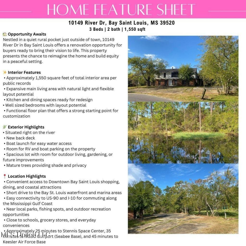 This is the waterfront opportunity you have been waiting for. Fish from your own backyard, launch your boat with ease, and enjoy everyday life surrounded by peaceful water views. Located at 10149 River Drive in Bay Saint Louis, this property offers 120 feet of waterfront frontage, a new roof, and a prime location just minutes from Downtown Bay Saint Louis, local restaurants, shops, and the beach, with convenient access to I 10 and US 90.Here, mornings can begin with coffee overlooking the water and evenings can end with sunset views after a day spent fishing or out on the boat. Tucked away in a quiet setting just outside of town, this home offers the privacy of coastal living while still being close to everything that makes Bay Saint Louis so desirable.Per public records, the home offers approximately 1,550 square feet of living space, featuring a spacious main living area filled with natural light and flexible layout possibilities. It presents an exceptional renovation opportunity for buyers ready to bring their vision to life while building equity and creating a personalized waterfront retreat.Situated on a 0.33 acre homesite, the property provides space to relax, entertain, and truly enjoy the outdoors. Enjoy water views, fish right from your property, and take advantage of the boat ramp for easy access to the water, along with a large driveway pad offering plenty of room for vehicles, boats, or gatherings with friends and family.Conveniently located approximately 25 to 30 minutes from Stennis Space Center and 40 to 45 minutes from NCBC Gulfport, this home is ideal for anyone looking to create a custom waterfront lifestyle in a peaceful Bay Saint Louis location.Showings are available by appointment only. Please do not walk the property without a scheduled showing.