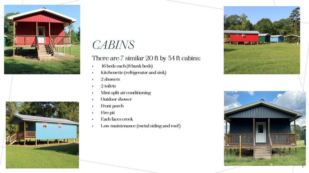 Camp Silver Creek-Welcome to a rare opportunity to own an 82? acre recreational retreat designed for hosting, exploring, and enjoying the outdoors. With a mix of cleared land, wooded habitat, and thoughtfully developed facilities, this property offers the ideal combination of comfort, recreation, and long-term income potential. At the heart of the property is a central pavilion featuring a fully furnished living space with 2 bedrooms, 16 total beds (8 bunk beds), a commercial-grade kitchen, a kitchenette with refrigerator and sink, 2 showers, 2 toilets, an outdoor shower, and mini-split A/C for year-round comfort. A covered front porch and fire pit overlook the nearby creek, creating a peaceful and scenic atmosphere. Built with metal siding and roofing, the structure is both durable and low-maintenance. Complementing the pavilion are 7 additional bunk-style cabins, each with 16 beds and designed with comfort and easy upkeep in mind. In total, the property can accommodate up to 125 guests, making it ideal for youth camps, church retreats, corporate events, family reunions, or short-term lodging opportunities. The retreat is currently being used by church groups and other youth-based organizations for a variety of outdoor programs and group gatherings. The land itself is just as impressive?approximately 82 acres including nearly 40 acres of wooded habitat with established trails for hiking, nature walks, or ATV rides. The remaining acreage includes open recreational space, a stocked pond, shaded picnic areas, and access to two beautiful spring-fed creeks ideal for kayaking, swimming, or simply relaxing by the water. What truly sets this property apart is its growth potential. There is ample room to expand cabin rentals, build additional lodging near the creek, develop a full-scale RV campsite, or add adventure features like an aerial zip line course or treehouse cabins. Whether you're planning a larger hospitality venture or simply want space to grow, this property offers unmatched flexibility and natural beauty. Nearby Attractions: The Yards Sportsplex Red Bluff (10 min) Bogue Chitto River (15?20 min) Lake Columbia / Lake Bill Waller (20 min) Hattiesburg (under 1 hour) New Orleans, Baton Rouge (2 hours) Jackson MS (less than 2 hours) Mobile AL (2.5 hours) Schedule your private tour today and see all this unique retreat has to offer!