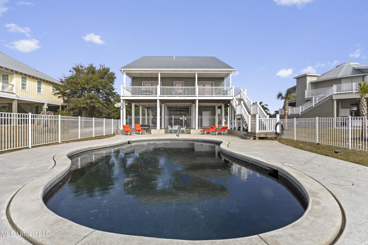 A private natural beach, concrete saltwater pool and breathtaking views make this ready to move into furnished and outfitted beachfront home a rare find. Built in 2006on a solid concrete foundation with solid concrete piers which supports the concrete floor. Perfect for your primary or second home in this serene, secluded, beach community on the Mississippi Gulf Coast. Enjoy inside and outside entertaining in the spacious living areas, the balcony and the pool area. The media room provides yet another entertainment opportunity. You will view spectacular sunrises, sunsets and the beautiful Mississippi Gulf from many rooms inside in addition to a balcony overlooking the gulf and the spacious pool area. The saltwater pool and deck area provide a wonderful water activity or relaxing option and plenty of space to hang out and soak up rays on the comfortable lounge chairs. The convenient pool side bath with a shower is another plus.